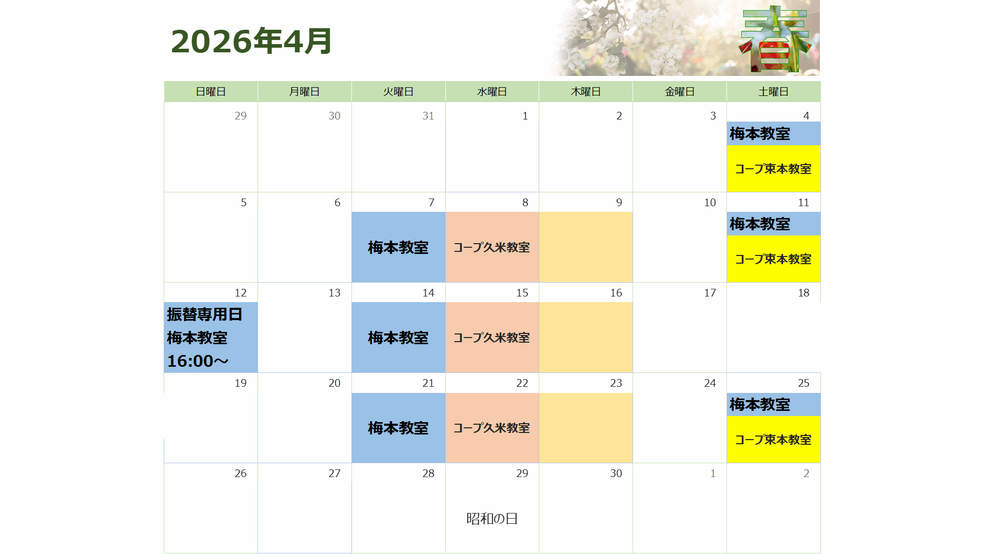 4月のお稽古日の変更を更新しました。